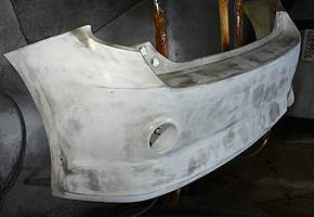 Before Rosie's could fit this rear bumper to the body, we needed to straighten all the waves and adjust some of the body lines. The stock mounting clips are not fiberglass-friendly, but we were able to install and remove this bumper numerous times with no cracks. The backup light was shaved and patched with fiberglass like the rest of the bumper.