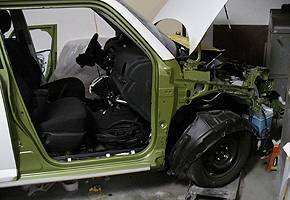 Owner Evan assisted Rosie's in taking this box completely apart. The poor UAB looked like a theft recovery with its gutted interior and dash, empty engine compartment, and no doors, hatch, hood, bumpers or fenders. The results are worth it, though, because the door, hatch, and underhood jambs are thoroughly and evenly painted with no oversprayed parts. Only an expert could tell what color this box used to be without seeing the 'before' photos.
