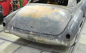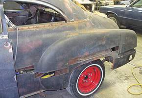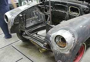 Here is the stripped down body as it arrived in the shop. Rick took some side-view photos and Pati cut them precisely to figure out what combination of inches subtracted would look best. Once it was decided, Pati transferred the cut lines to the car. Precision is everything in this step.